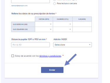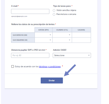 3. Rellena datos de prescripción, presiona enviar, y ve a seleccionar las lunas